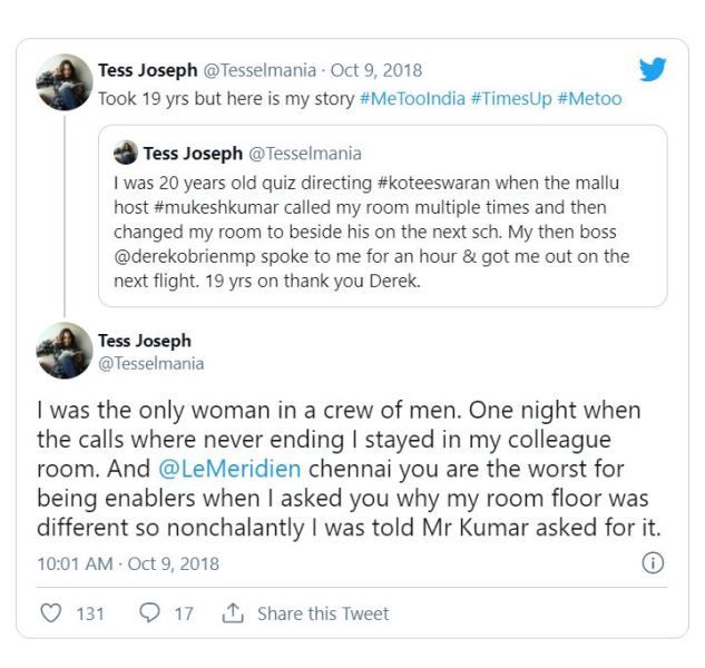 Mukesh Madhavan was accused by the Bollywood casting director Tess Joseph of sexual harassment with the #meetoo trend. Tess Joseph and Mukesh Madhavan were working for the same game show Koteeshwaran.  She mentioned that Mukesh used to call her multiple times over the phone, during the shoot of a game show. On 9 October 2018, Tess took over her Twitter account to spoke about her ordeal that took place nearly two decades ago.